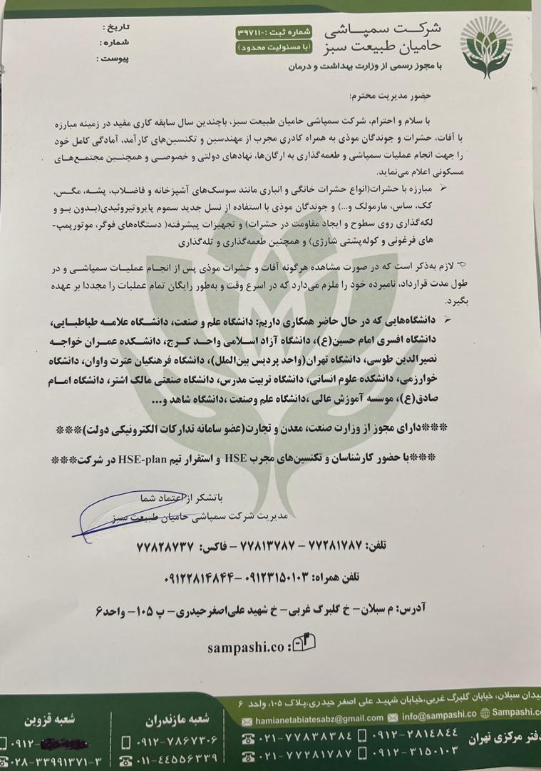 برای مشاوره تخصصی رایگان و ثبت درخواست سمپاشی تضمینی، همین حالا با ما تماس بگیرید:
